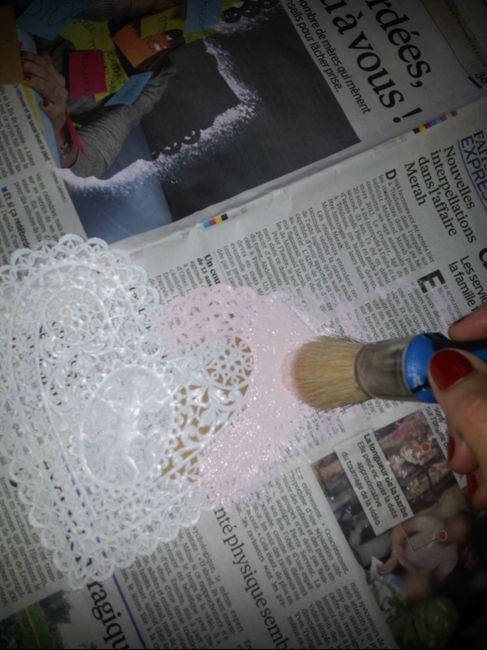 Vous avez besoin de protéger votre espace de travail, d'un pot de peinture différente de la couleur des étiquettes, des étiquettes bien évidement, d'un naperon en papier, d'un peinceau à poil dur. Vous positionnez le naperron en dentelle papier sur...