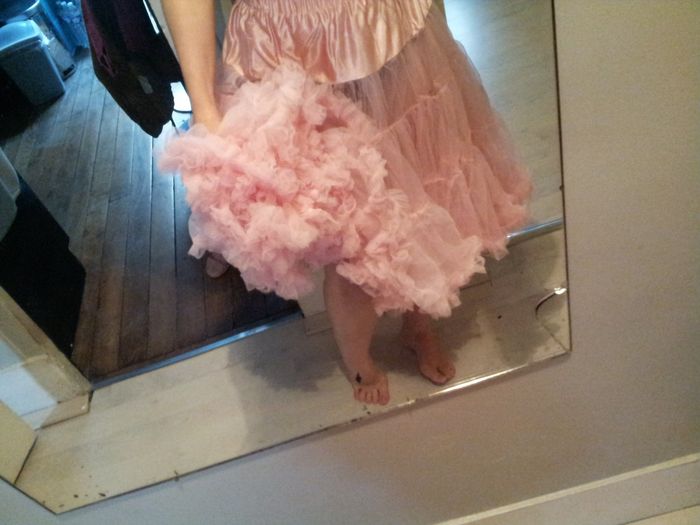 Coucou, pour celles qui suivent mes posts, vous savez que je porterais une robe courte sous laquelle je mettrais mon jupon coloré..... Mais après les essayages j'ai eu tellement chaud aux jambes, que je pense que le 13 juillet ça va être...
