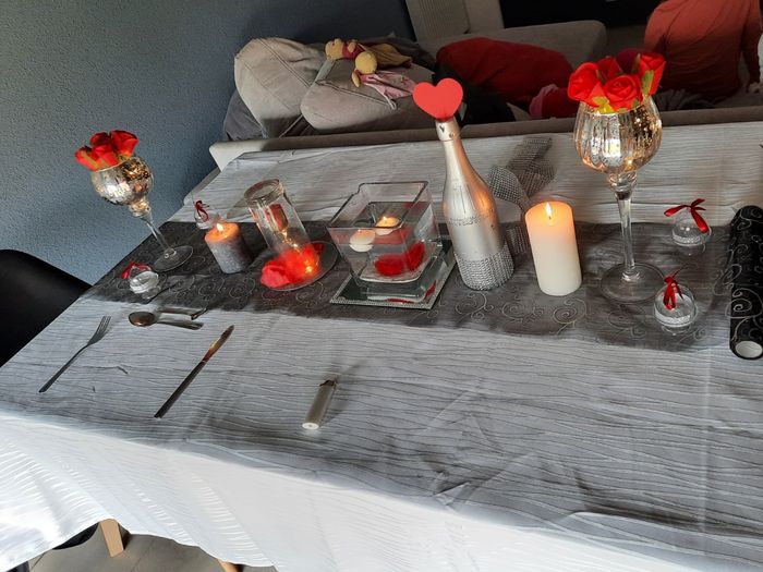 Il y a 1478 joursBonjour à toutes après avoir changer je ne sais combien de fois d avis voici mon dernier essai de table Dans les grand verres sa sera des vrais fleurs rose rouge et sur la bouteille argent la décoration n est pas coller en bas car il manque de la...