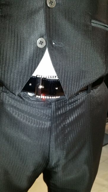 Ça y est le choix est fait chéri a son costume ce sera celui ci. La veste est noire satinée et le pantalon et le gilet rayées la ceinture et strass en rappel de la bague de cravate et bien sûr ma robe alors votre avis? Il est pas beau mon chéri?...