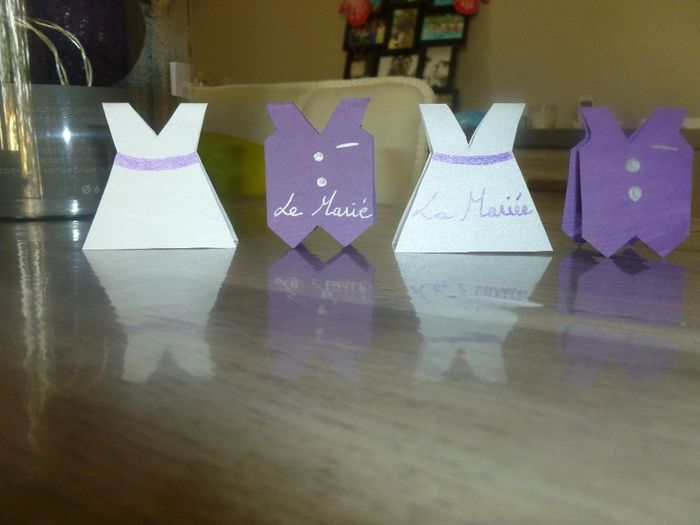 Voilà un petit aperçu de ma déco Urne arbre à empreinte Porte alliance Marques places Table photo Internet j aurais les mêmes chemin de table Menus avec les violette pour lumière d ambiance Centres de table même idée bougies violettes et fêlures...