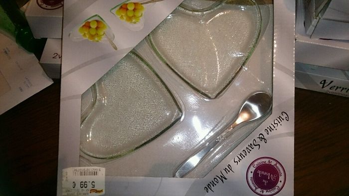 C'est pas grand chose mais en nous promenant on est tombé sur ces coupelles en promo (3€ les 2) et on les a prises pour mettre des dragées sur les tables. En plus on pourra s'en resservir après...