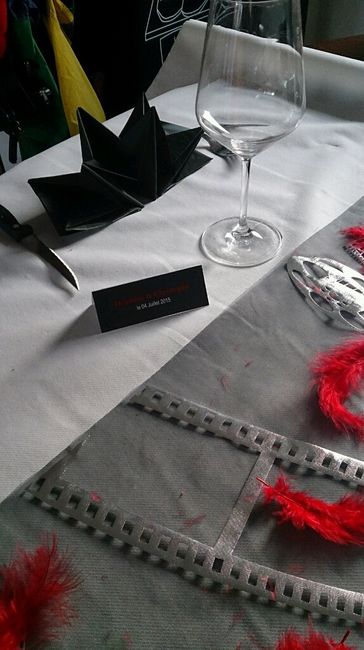 Voilà on a essayé notre déco de table après réception des chemins de table. Il manque quelques diamants avec les plumes sur le chemin et bien sûr le centre de table, qu'en pensez-vous ???