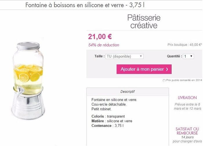 Hello ! Si ça peut en aider certain(e)s : il y a une vente privée (Pâtisserie Créative) sur Showroomprivé depuis ce matin et ils vendent des fontaines à boisson comme ça (je sais qu'on est plusieurs à en chercher dans ce style !) 3,10€ de frais de...