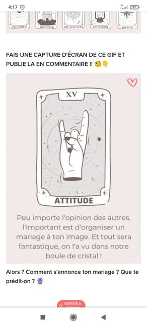 Coucou tout le monde 💜 Merci d'avoir participé jusqu'au bout ! Maintenant qu'on en sait un peu plus sur ton mariage, on va pouvoir tirer les cartes... FAIS UNE CAPTURE D'ÉCRAN DE CE GIF ET PUBLIE LA EN COMMENTAIRE !! 🧐👇 Alors ? Comment s'annonce ton...
