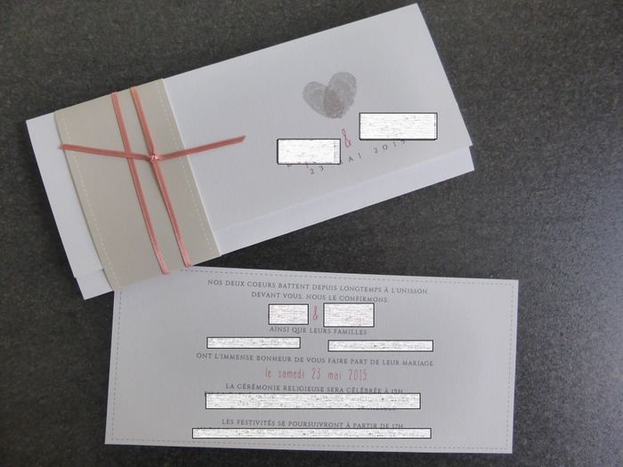Hello les brides... Levée de bonne heure + pluie + dimanche matin en pyjama = Test des faire-part!!! faire part 1, la face avant, à la place des coueur, il y aura nos prénom et la date. Le tampon n'est pas encore reçu. Le papier est du pollen de...