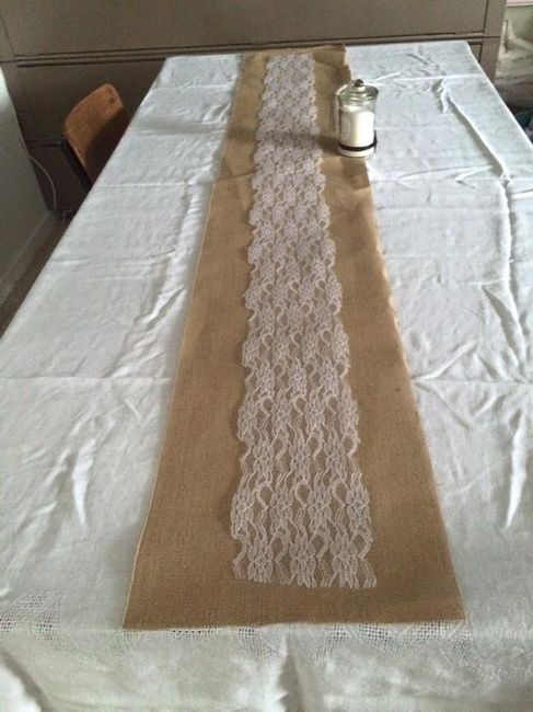 pour la deco des tables j'ai penser a un centre de table en toile de jute et dentelle, j'ai pu voir sur internet que sa existait tout fait mais pareille assez cher alors j'ai decider une fois de plus de le faire moi meme ( plus qu'a coudre et couper...