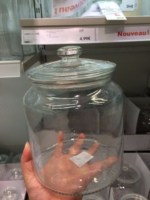 Coucou ! Je suis allée me promener chez Ikea hier à la recherche d'une grosse bombonnière pas trop chère pour les dragées qu'il me restait après avoir rempli tout mes contenants + la déco... Pour 5€ j'ai pu prendre ceci, et je trouve que ça rend...