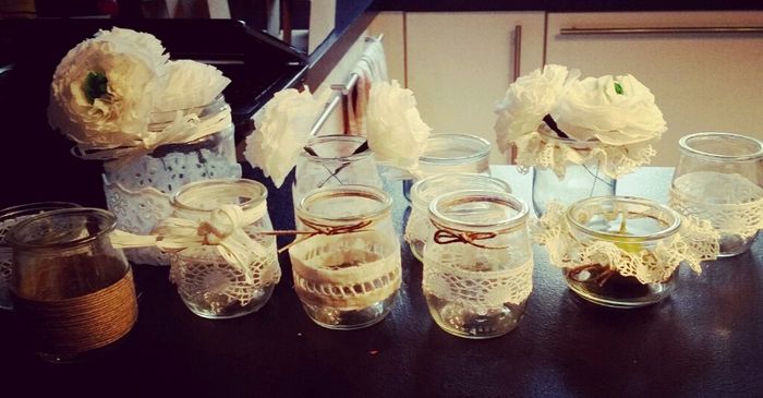 Et voilà je continue dans la lancée de préparatifs.. Aujourd'hui je testé mes petits pots en verre...Je ne sais pas ce que vous en pensez moi j'aime beaucoup. Mon thème est "dentelle vintage".Je pense mettre un peu de ficelle sur le dessus mais rien...