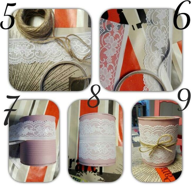 Deuxième Tuto de la journée. Boite de conserve dentelle et ficelle. Ce qu'il vous faut: (réf: 1) - 1 boite de conserve propre sans colle- peinture + pinceaux- ciseaux- ficelle de jute- dentelle ( ici en plastique)- adhésif double face transparent...