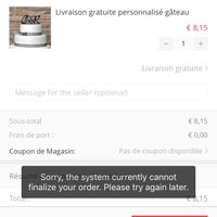 Il y a 3732 joursBonjour, Nous avons craquer sur un cakes topper sur ali express problème impossible de passer commande ( j ai aussi essayé pour d autres produits ) que ce soit sur mon smartphone ou mon ordi j ai systématiquement un message d erreur Si quelqu un peut...