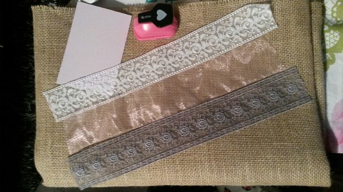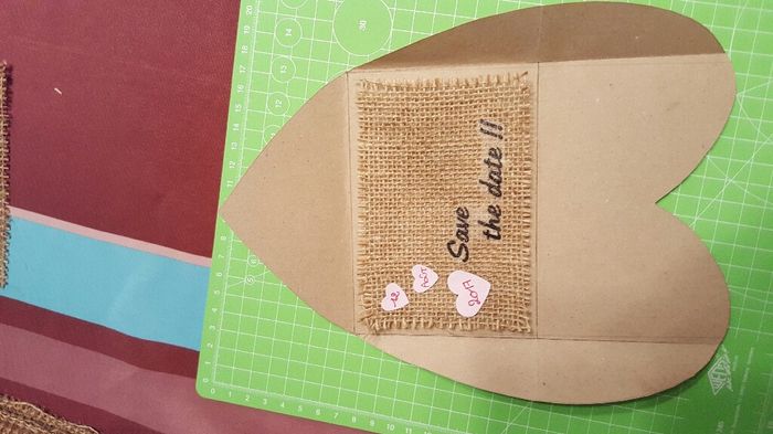 Coucou à toutes!! On avance dans nos std!! Toile de jute découpée, imprimée et durcie!!Maquette de l'enveloppe faite: enveloppe faite maison, tampon embossé, .. Reste la photo à coller avec un ruban de dentelle et les coeurs perforés qui sont prêts à...