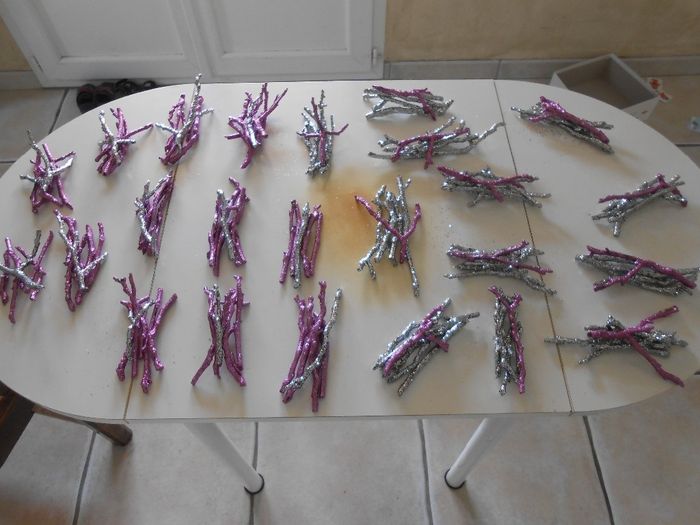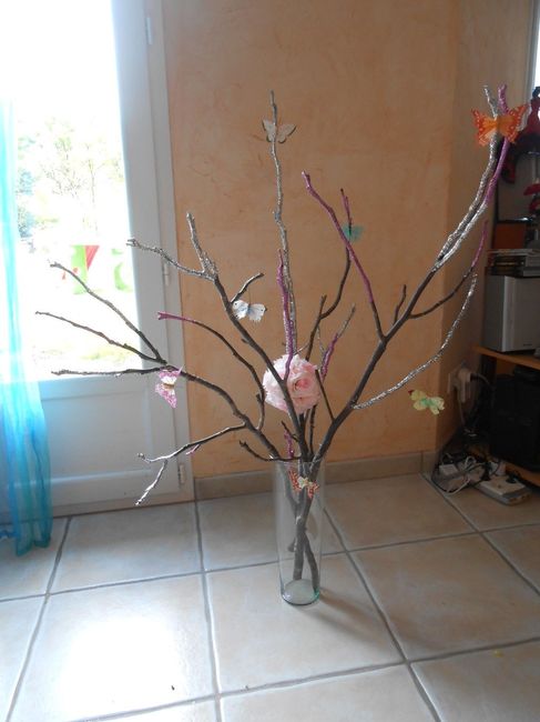 Bonjour, je continue dans mes branches z'et paillettes! Cette fois j'ai récupéré de grandes branches un peu tordues pour mettre dans un vase haut ( 40cm) sur la table du VH. J'ai pailletté le bout de certaines branches en rose ou en argent, et...