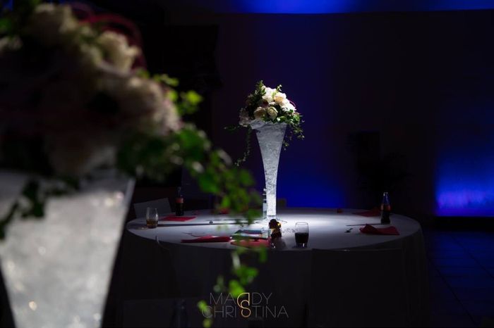 Vous préférez la composition sur un chandelier ou un vase martini? On aura la composition roses blanches et orchidées blanches comme sur les photos mais on ne sait pas si on le fera sur un chandelier ou un vase martini