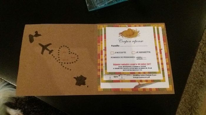 Salut les filles , j'ai enfin fini ma maquette et j'ai effectué un prototype , je n'avais pas le papier qui me fallais , la carte double sera en kraft , les cartes simples en ivoire ( comme le coupon réponse ) ,et le noeud en papier sera en tissus et...
