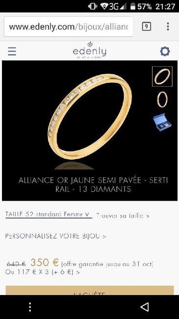 Enfin eu ma bague de fiançailles, pour la petite histoire a la base avec mon fiancé, on avais acheté une baguebchez histoire d'or.Seulement après une chute malencontreuse de la dite bague, elle a eu un choc.J'ai la chance dhabiter a côté dune...