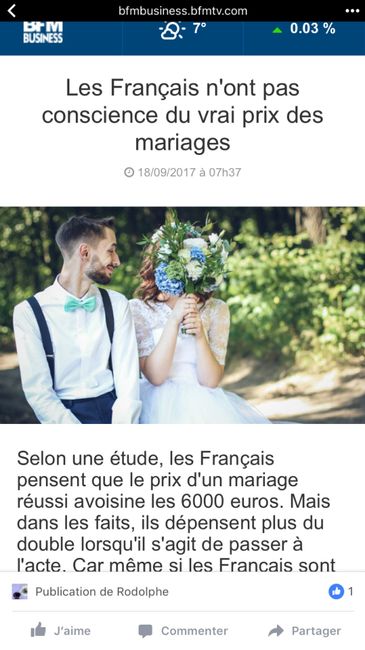 Il y a 3131 joursSalut les filles y a un article qui vient de sortir sur le site de BFM concernant le budget ! Si ca peut donner une idee aux fraîchement fiancés ! 👌
