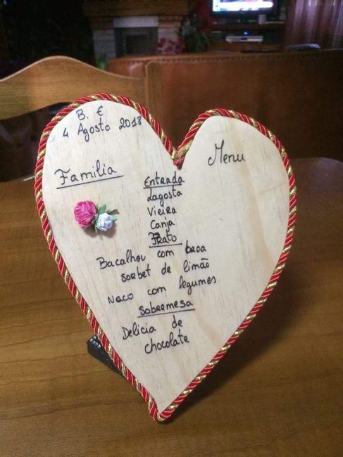 Bonjour les brides je vous présente mes menu qui font aussi les nom de table pour savoir où chaqu'un va s'assoir... tout et fais maison c'est mon papa qui les a fais... ( par contre c'est ecris en portugais car le mariage sera fais au portugal)...