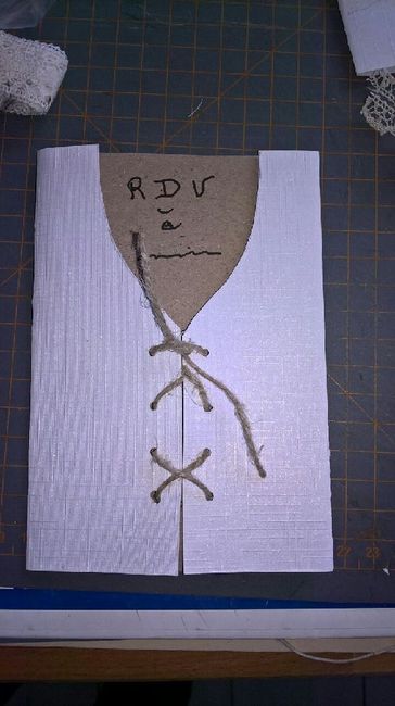Préparation en cours ..... ou en somme nous ?! Nous devons colorer la dentelle car elle ne ressortaispas sur la pochette blanche ... Le noeuds en ficelle ne sera pas tout à fait comme cela mais avec une ficelle plus fine et moins effilochee ! Nous...