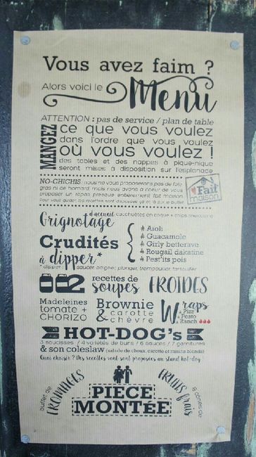 Bonjour à toutes je recherche un panneau pour nôtre buffet avec une phrase s'impa comme je souhaite pas de plant de table avez vous dès idée du style pas de plant table mais venez manger et boire et surtout profiter de la soirée à faire la fête