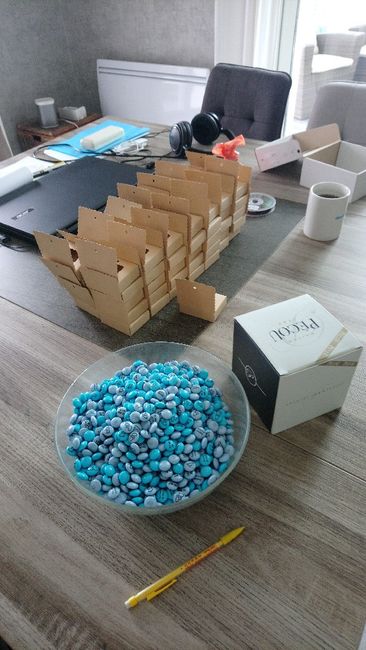 Il y a 2551 joursVoilà la mise en boîte est faite !!! 95 boîtes à monter, remplir de dragées et mnm's et puis mettre le petit nœud... Ce soir j'ai mal aux doigts AHAHAH 😂🤣