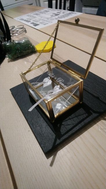 Coucou tous le monde. Voilà moi je part sur une boîte à alliances en verre et laiton en forme rectangulaire. Je voudrai un peu la personnalisé avec nos noms et date de mariage. Mais je suis curieuse. Si vous voulez bien faites moi voir les vôtres....