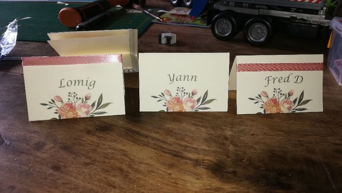 Je suis en train de finioler mes éléments de déco, jai enfin fini mon plan de table et je faisais le point sur mes marques places... A la base, je les trouve un peu simples... Jai pensé les poser sur un petit rondin de bois ou les fixer sur du liège...