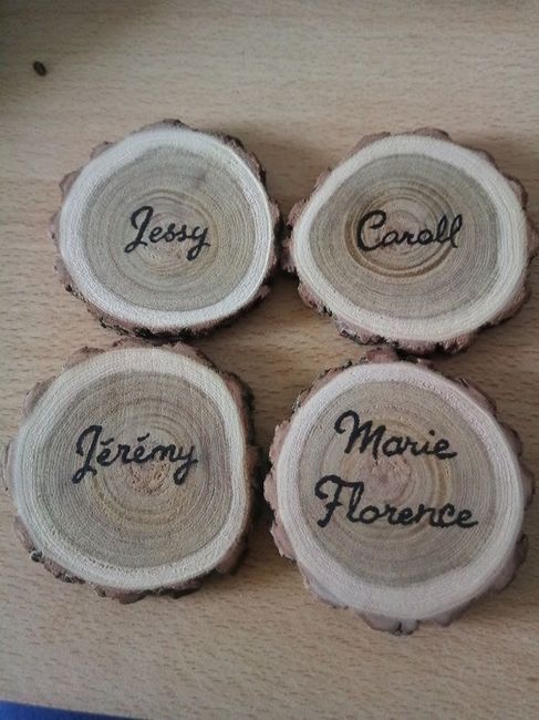 Marque-places en tranche de charbonnette Décoration de pot en verre Marque-places: On a coupé de la charbonnette à la scie à onglet, poncé les faces. A l'aide de papier calque nous avons reporté les prénoms au crayon papier puis repassé dessus au...