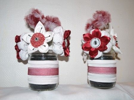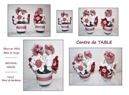 Voici nos centres de table entièrement réalisés par mes soins à partir de tissu. Chaque pétale est cousu main et assemblé pour former la fleur. Les fleurs sont décorées avec des boutons, perles et pistils! Deux fleurs ponpons en tulle donnent une...