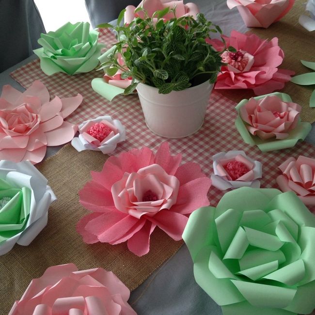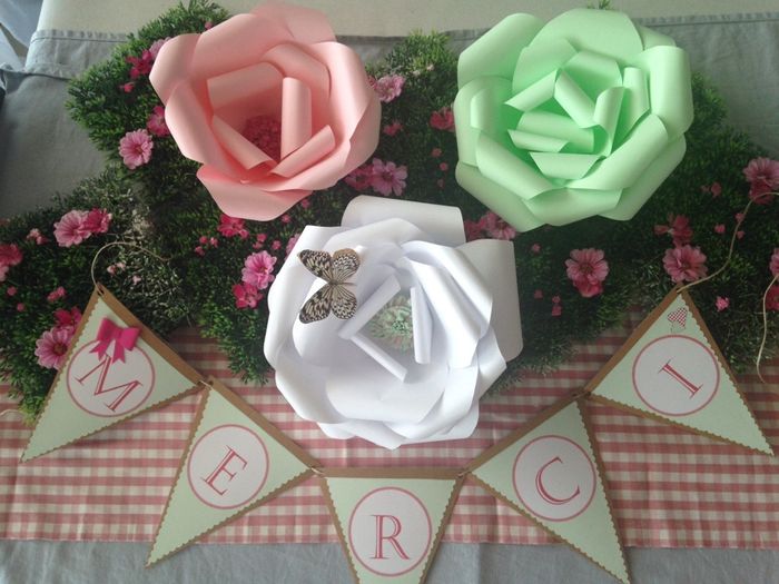 Coucou !Voilou un nouveau chemin de table, de fleurs en papier, dans les tons roses fuchsia et vert anis ... Frais et printanier