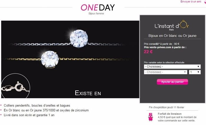 Bonjour tout le monde,Un bon plan à partager avec vous : sur vente privée il y a une vente One Day l Instant d Or. Bagues, collier, BO en or jaune ou blanc à des prix super intéressants! Bon shopping!