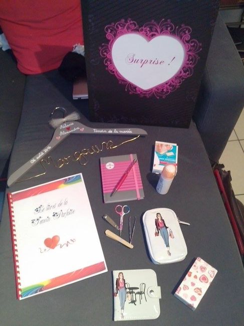 Ca y est, ils sont prêts à être offerts. Ca tombe bien, je vois ma témoin demain (aïe, aïe, aïe, boule au ventre...) Le sac vient de chez gémo, un peu grand mais le seul que j'ai trouvé qui pouvait contenir le cintre sans qu'il dépasse. Le stylo...