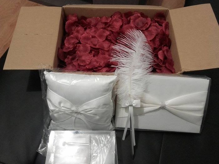 coucou les filles!!!!! voila on a acheté aujourd'hui le livre d'or avec le porte plume et je coussin à alliances qui sera normalement brodé de nos initiales par mamie de cheri!, puis des pétales bordeau 0.48 cts les 100 donc on en a pris 10 paquets...