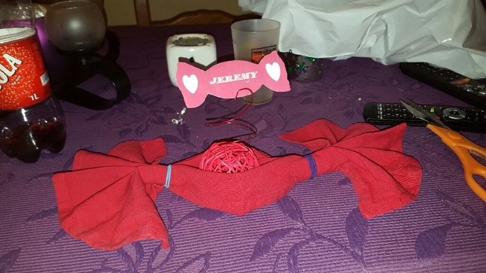 Coucou voilà les serviettes qui seront dan les assiettesMaman a eu l'idée Ma mamie les a réalisés A l'intérieur de la petite boule ceux sont des mms personnalisés que ma future belle mère nous a offert Je Suis fan !