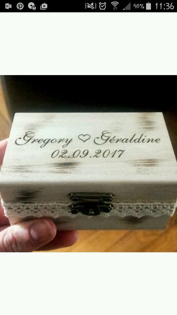 Une jolie surprise en arrivant ce soir, notre boîte à alliances est enfin arrivée.J'avoue que je suis un peu déçue de la couleur qui rendait mieux en photo, ici je trouve que l'écriture ne ressort pas assez car la couleur du bois est très foncée. Et...