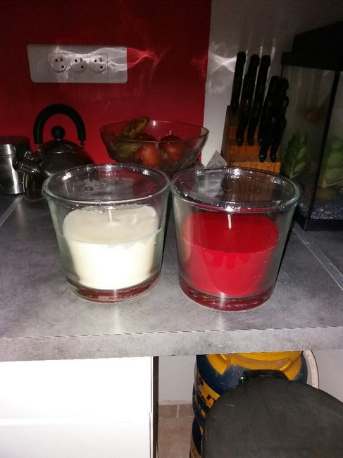 ce matin en allant faire quelques courses à Lidl qu'est ce que je vois des grosses bougies de la couleur du mariage et hop pour bibi😀😁