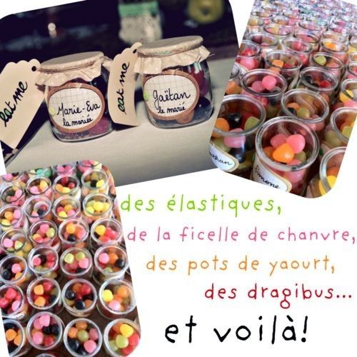 Bonjour à toutes.Voila je ne suis pas trop fan des traditionnels dragés. Nous avons décidé de faire des petits pots de differentes confiture (nous avons pu congeler un grand nombre de fruits differents du jardin) et crème de marron. Les pots seront...