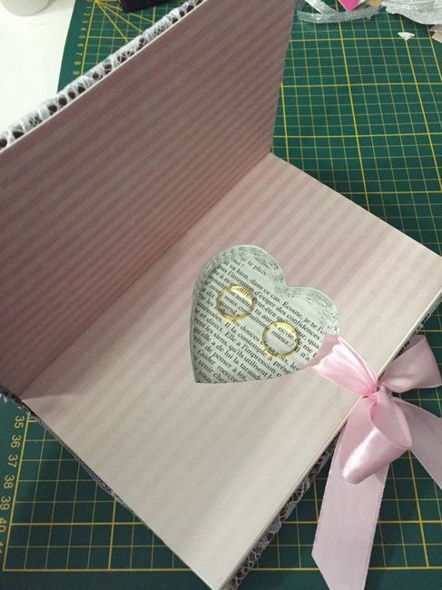 Porte alliance livre Je souhaitais trouver une idée originale pour les alliances. Lors d'une chine j'ai trouvé un vieux livre avec une belle couverture en cuir. A l'intérieur, j'y ai découpé un coeur (travail long et minutieux), j'y ai ajouté 2...