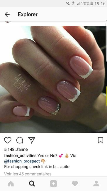Hello tout le monde. Est-ce que certaines d'entre vous vont faire tout simplement une french manucure pour le jour J ? Moi je voulais faire ça mais je me demande si ça ne fera pas trop simple pour le jour J ?!?
