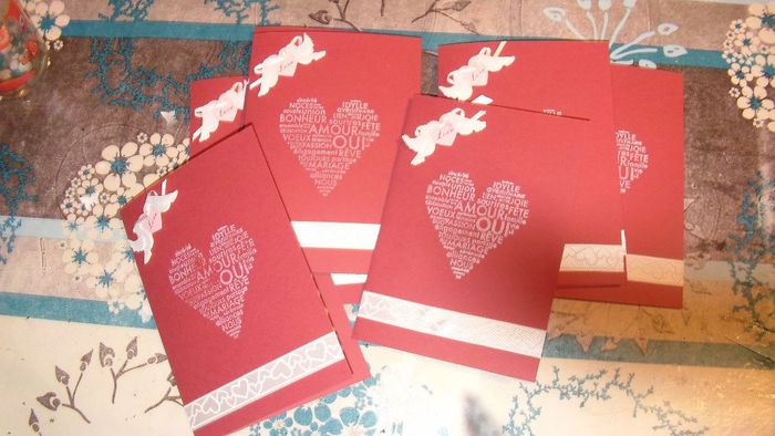 Coucou les Girls & Boys !!! Avec mon homme, nous nous sommes lancés dans nos FP aujourd'hui. Lui aux textes devant l'ordi et moi au découpage, collage, tamponnage, accrochage etc etc lol Nous avons fini ceux pour les invités au VH et au repas ,...