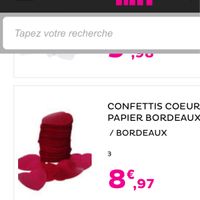 Il y a 3210 joursBonjour Est ce que quelqu'un de vous aurait un site a me recommander pour des confettis coeurs à lancer en sortie de mairie de couleur bordeaux. Car j'en ai commandé chez tati Et à réception ils ne sont pas bordeaux (rouge tres foncé - cf photo du...