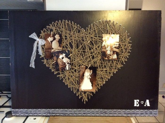Salut la commu! Voici mon DIY de l'après-midi. Pour le coin photobooth où il y aura une échelle escabeau et un grand coffre en bois. Je ne savais pas comment présenter les photos de mariage de nos parents et grands-parents. Alors voilà: une planche...