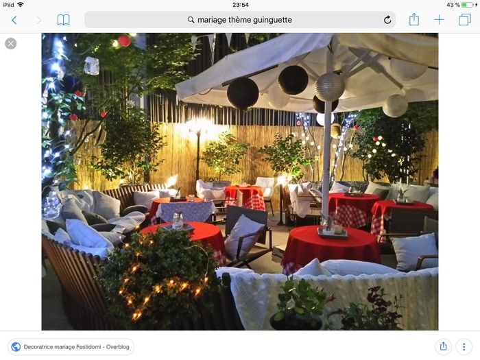 Bonjour les brides! Nous avons choisi pour notre mariage le thème guinguette! On veut un esprit bonne franquette, cool et détendu! Y a t il des mariés ayant choisi ce thème et qui aurait des idées de décoration? Des photos à montrer? Nous, on est à...