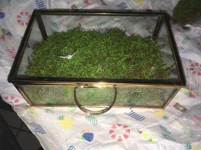 Et voila j'ai fini ma boite a alliance. J'ai acheter cette petite boite a 5€ chez flying Tiger, puis de la mousse chez action a 1€99 et j'ai pulvériser de la peinture verte pomme avec un peu d'eau à l'aide d'un "pchit pchit" pour donner une belle...