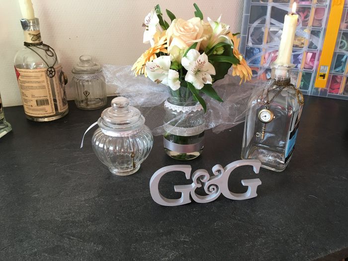 Hey ! Les futures 😉 nous avons refait nos bocaux à fleur et on s’est attaqué à nos menus photo1 bocaux befor photo 2 bocaux after photo 3 menus boissons photo 4 toute notre deco de table et le cadre menus repas à vos critiques....😜😊