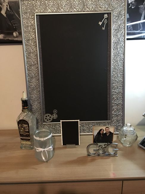 Bonsoir tous une journée bien rempli le cadre pour le menu on vient à peine de terminé il étais blanc un coup de peinture métallisé et ardoise plus tard ...😍😍😍😍 et mes petit pots pour que les invités ce servent en bonbon j’en suis à la moitié petite...