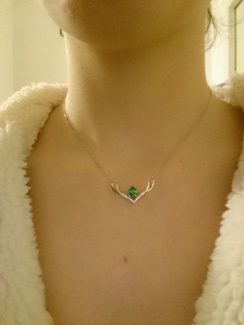 Hier soir je rentre à la maison et là mon chéri m'offre une petite boîte renfermant ce que je voulais mettre pour le mariage en collier mais encore mieux que ce que j'avais pensé (il fait un peu bois de cerf avec une pierre de la couleur que je...