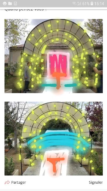 Bonjour à tous. Tout le monde me conseille defaire la cérémonie laïque sous cette grosse pergola. On me dis qu il y auras asser de place pour 50 chaises qui partiraient en V. Le problème c est comment décorer ça et est ce vraiment une bonne idée ? Je...