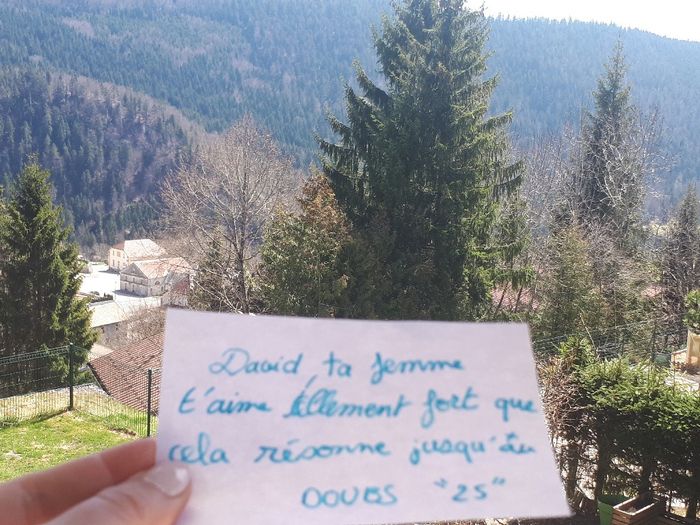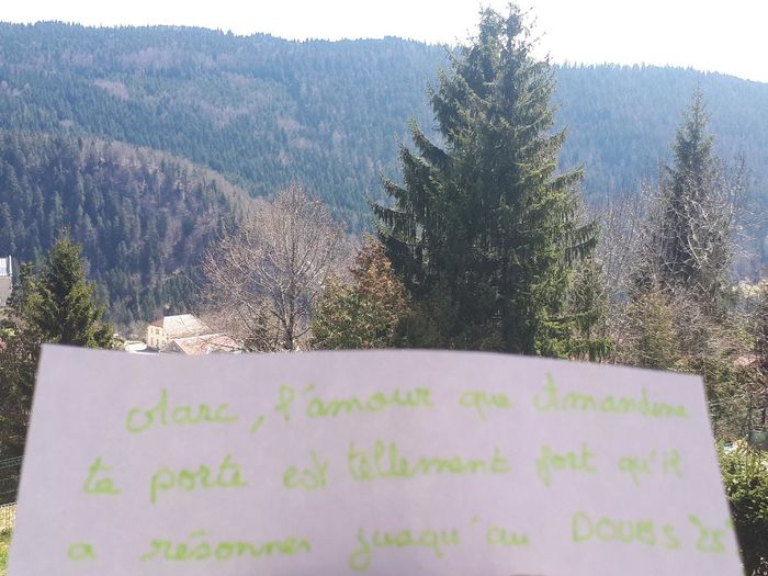 Bonjour a tous, je reposte une nouvelle fois, je voudrais un love note mais seul une personne me la fait 😢 Pourrait vous m'en faire un avec la phrase : Marc, l'amour que Amandine te porte est tellement fort qu'il a résonner jusqu'à (ville) s'il vous...