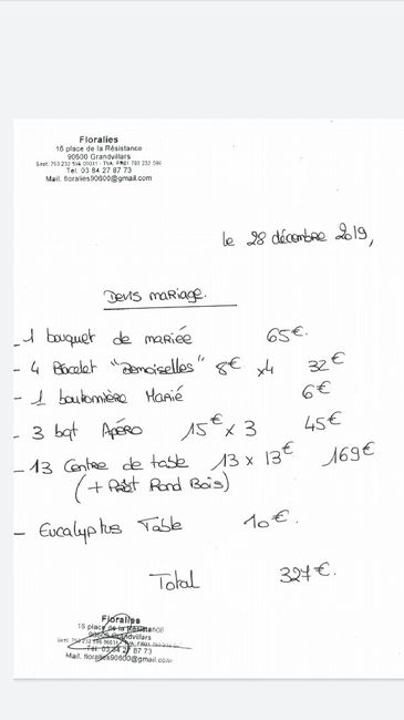 Salut à tous Petite déception du jour, nous avons demander un devis à une fleuriste que nous avons rentrée au salon du mariage et la douche froid ... nous voulons pas mal de fleure mais avons un budget de 1000/1500€ (ce qui et plutôt correcte je...